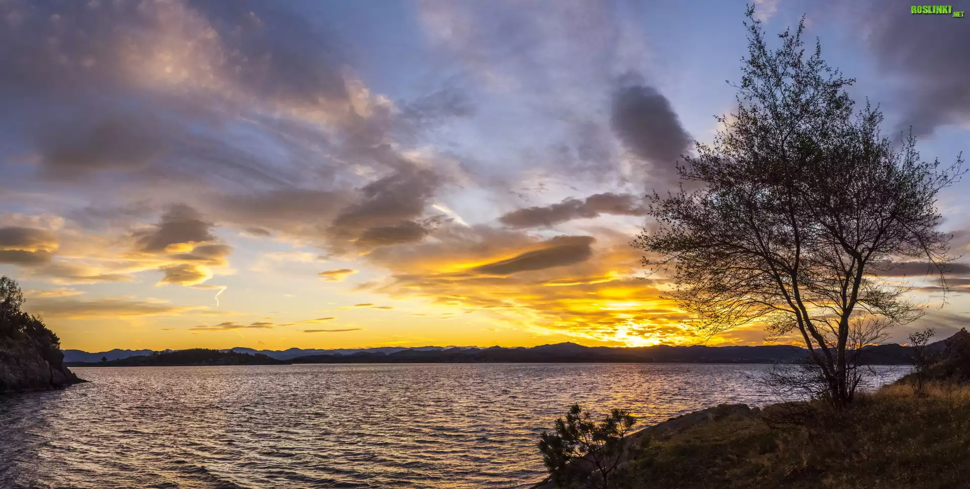 Rośliny: Norwegia, Okręg Rogaland, Jezioro, Zachód słońca, Drzewa, Chmury