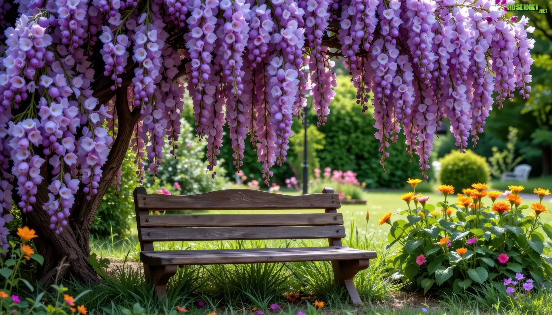 Rośliny: Fioletowe, Kwiaty, Ławka, Okwiecone, Drzewo, Grafika AI