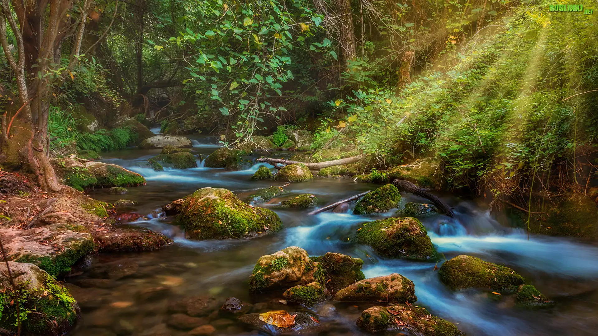 Rośliny: Rzeka, Omszałe, Kamienie, Las, Drzewa, Roślinność, Przebijające światło