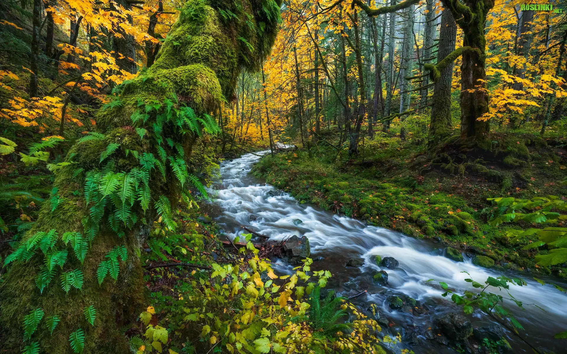 Las, Strumyk, Drzewa, Omszały, Pień, Paprocie, Jesień