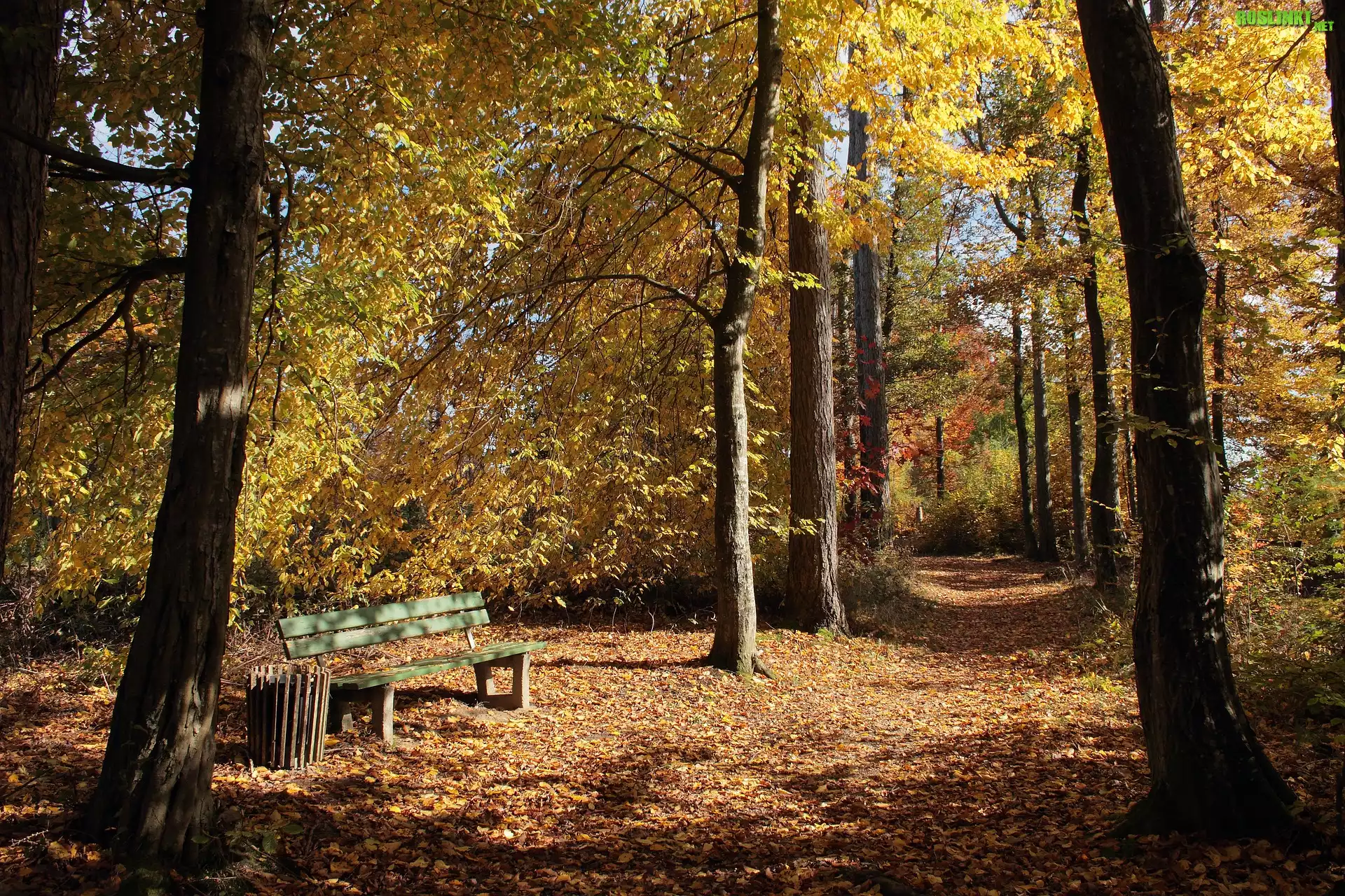 Rośliny: Jesień, Las, Ławka, Opadłe, Liście, Drzewa, Ścieżka