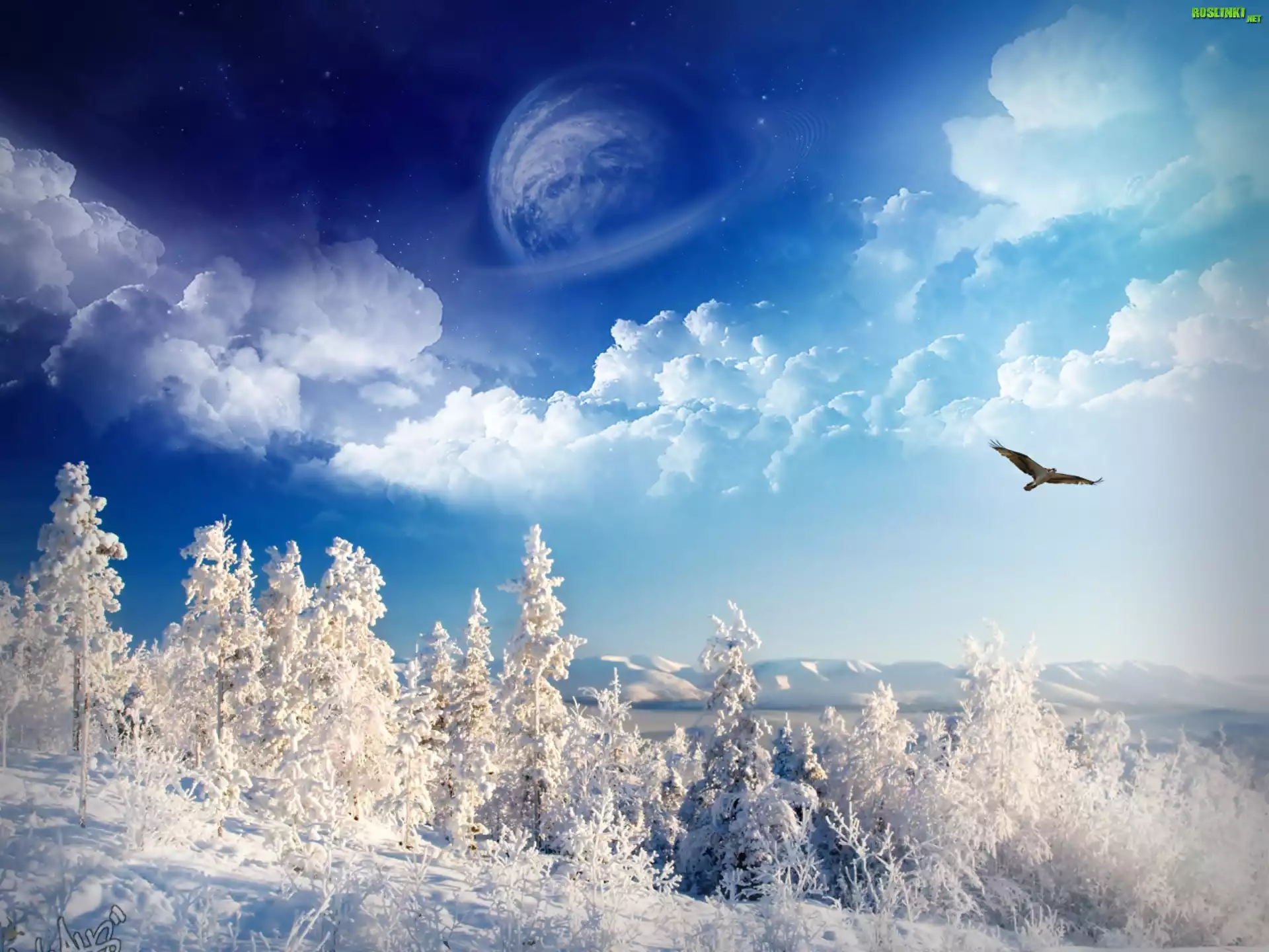 Rośliny: Ośnieżone, Drzewa, Góry, Chmury, Ptak