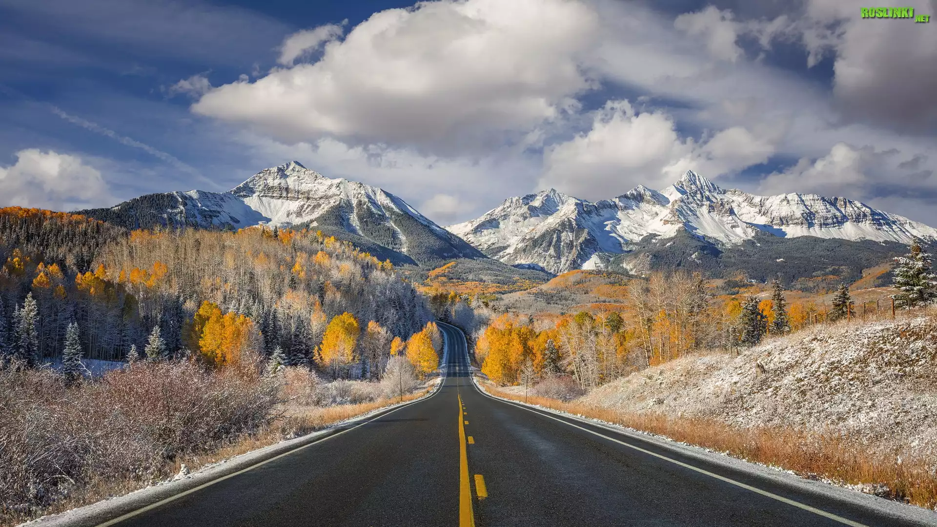 Droga, Jesień, Drzewa, Lasy, Ośnieżone, Góry, San Miguel, Góra, Mount Wilson, Kolorado, Stany Zjednoczone |