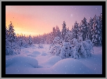 Zima, Las, Drzewa, Ośnieżone, Zaspy, Wschód słońca