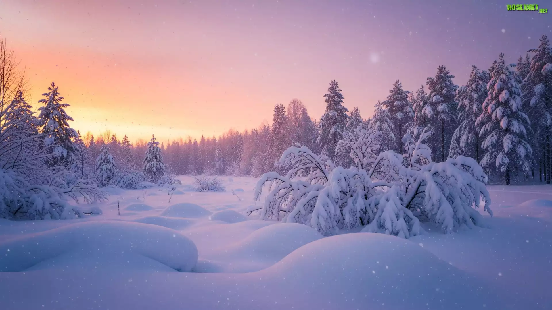 Rośliny: Zima, Las, Drzewa, Ośnieżone, Zaspy, Wschód słońca