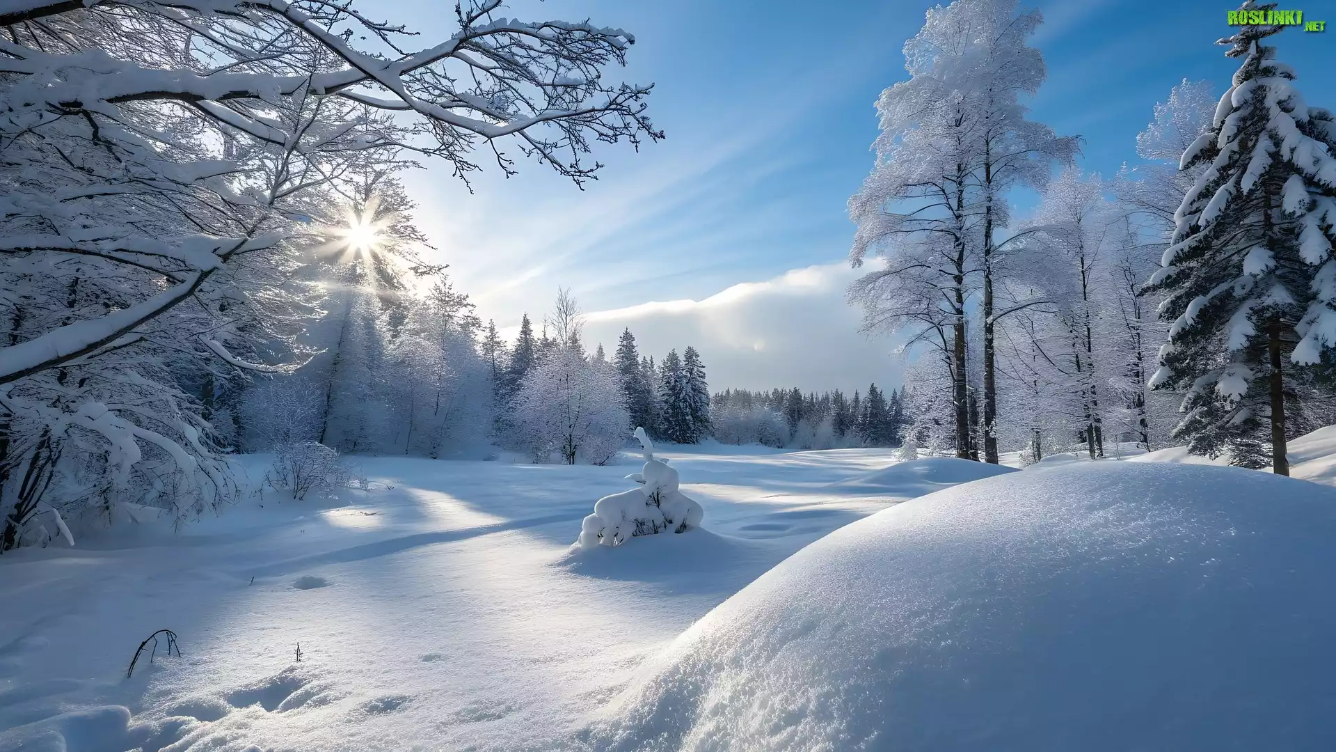 Rośliny: Zima, Ośnieżone, Drzewa, Słońce, Zaspy