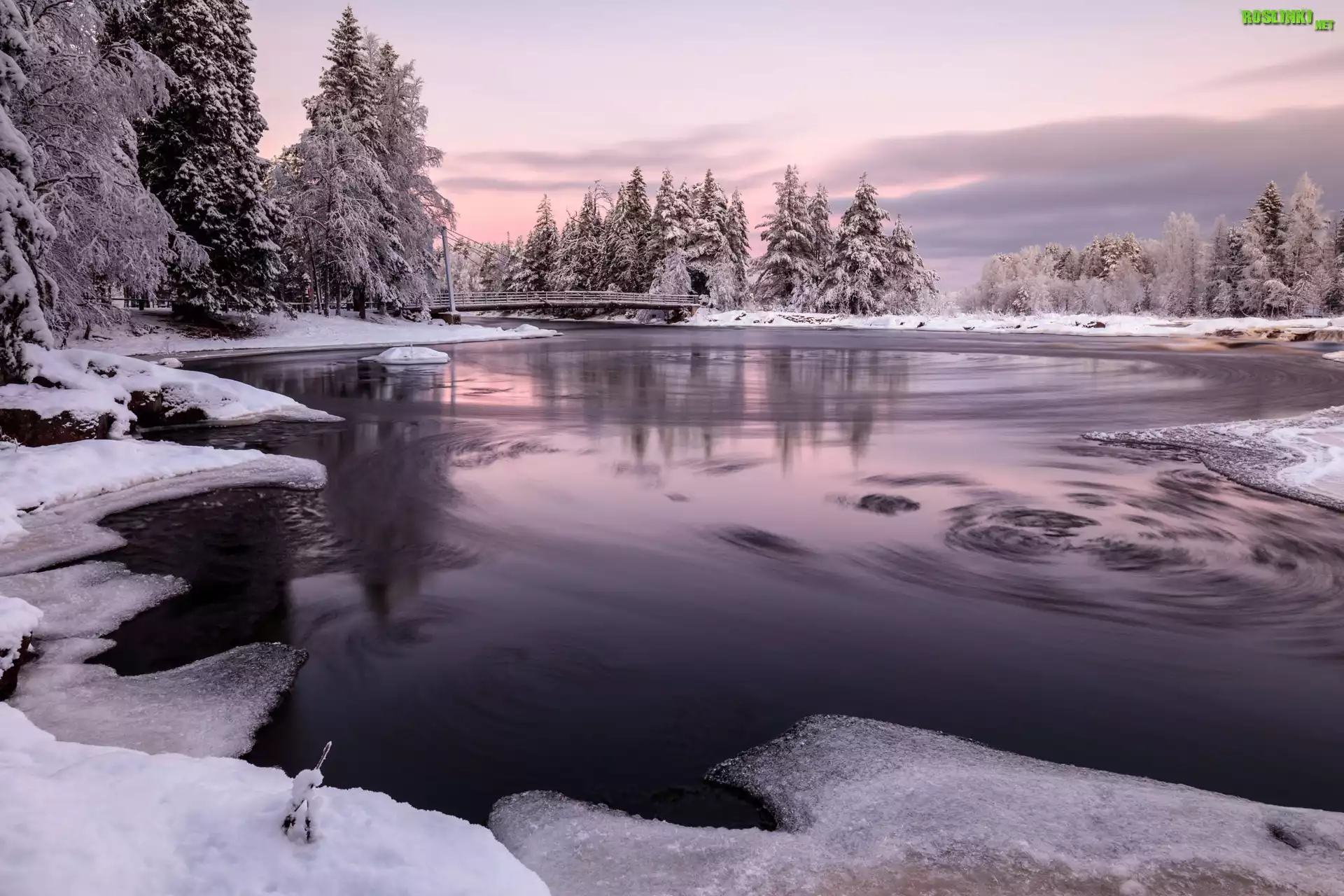 Rośliny: Zima, Ośnieżone, Drzewa, Most, Rzeka Oulujoki, Oulu, Finlandia