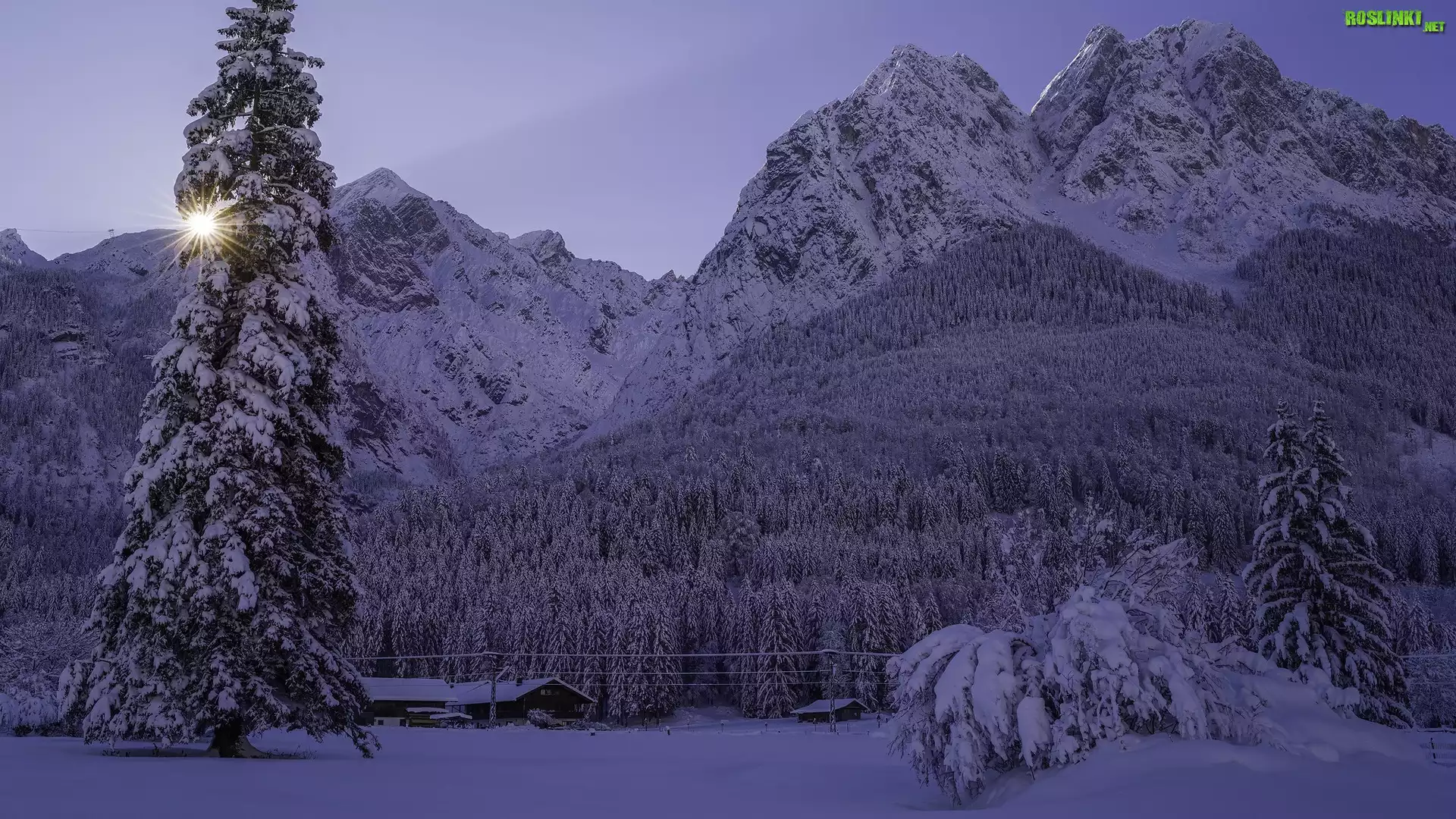 Rośliny: Zima, Las, Góry, Ośnieżone, Drzewa, Domy, Słońce