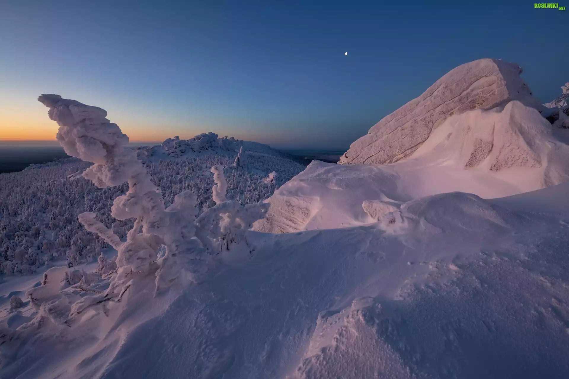Rośliny: Zima, Śnieg, Góry, Ośnieżone, Drzewa, Zaspy, Poranek
