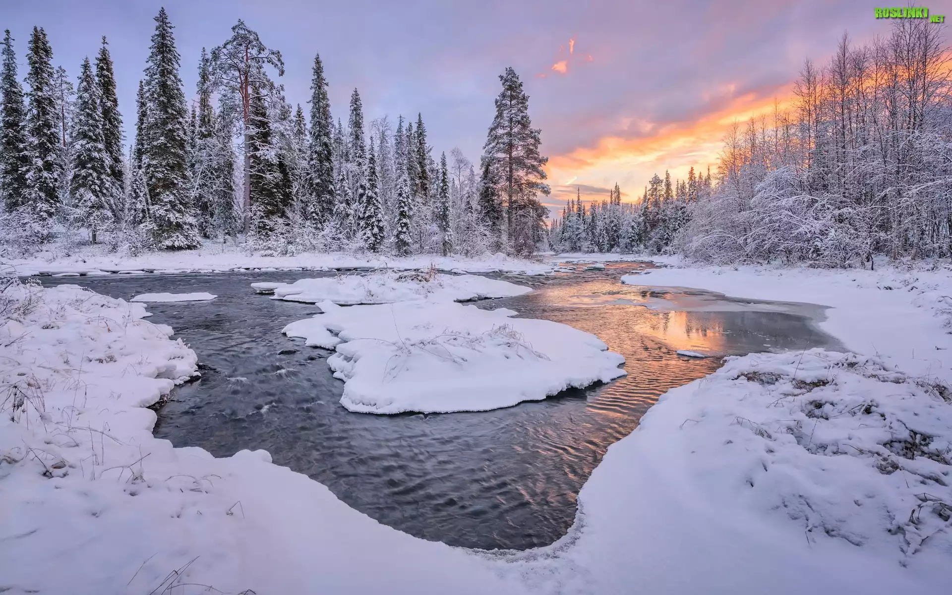 Rosja, Półwysep Kolski, Rzeka Kola, Zima, Drzewa, Ośnieżone