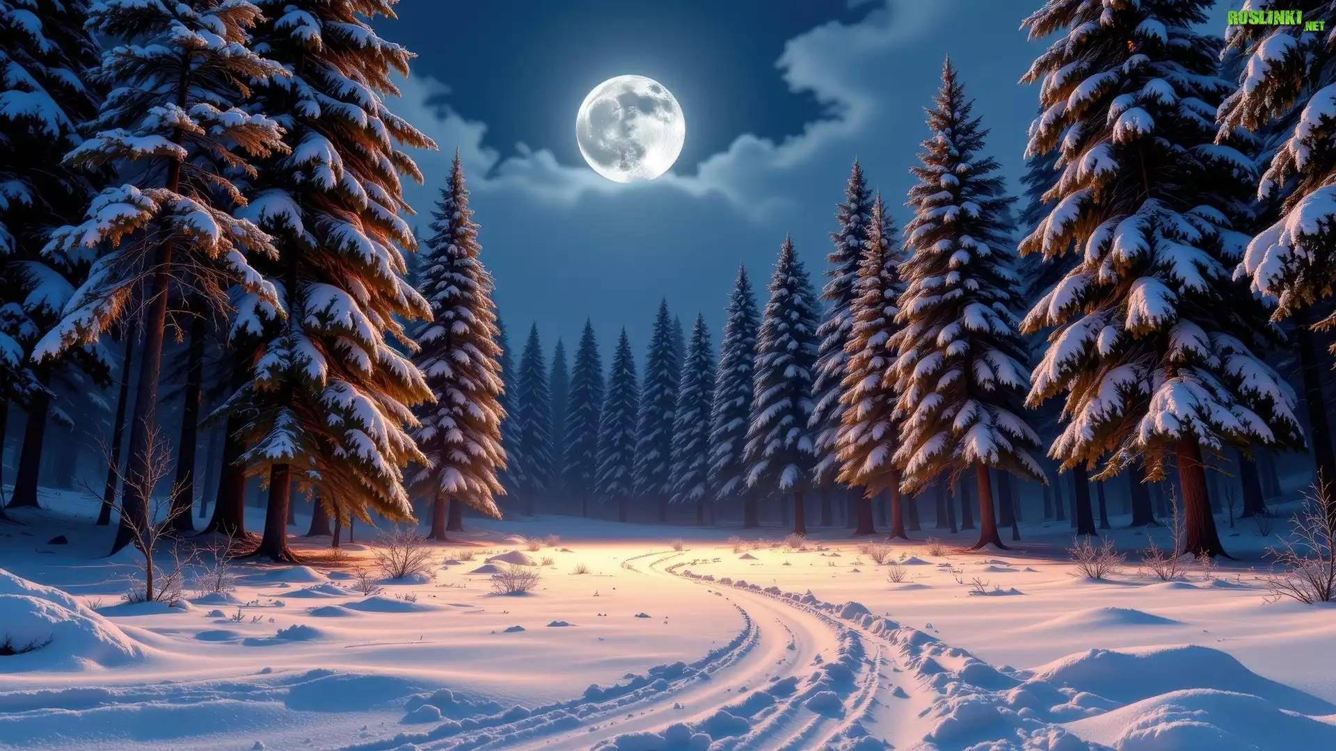 Rośliny: Zima, Noc, Księżyc, Ośnieżone, Drzewa, Zaśnieżona, Droga