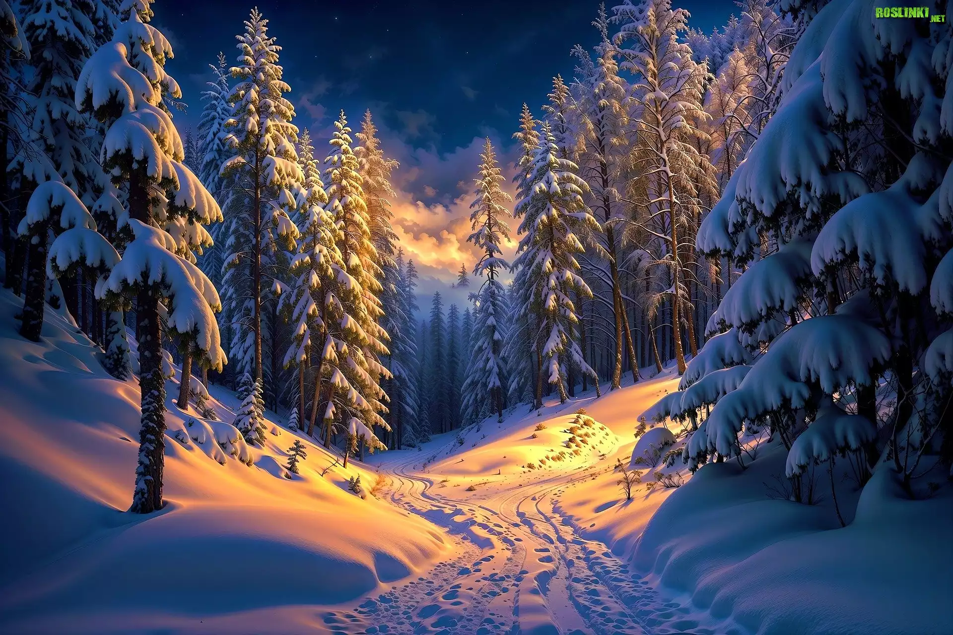 Rośliny: Zima, Droga, Las, Ośnieżone, Drzewa, Noc, Grafika