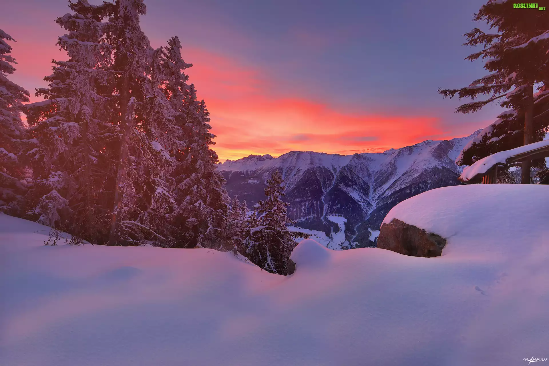 Zima, Góry, Śnieg, Ośnieżone, Drzewa, Poranek