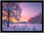 Zima, Drzewa, Krzewy, Ośnieżone, Zachód słońca