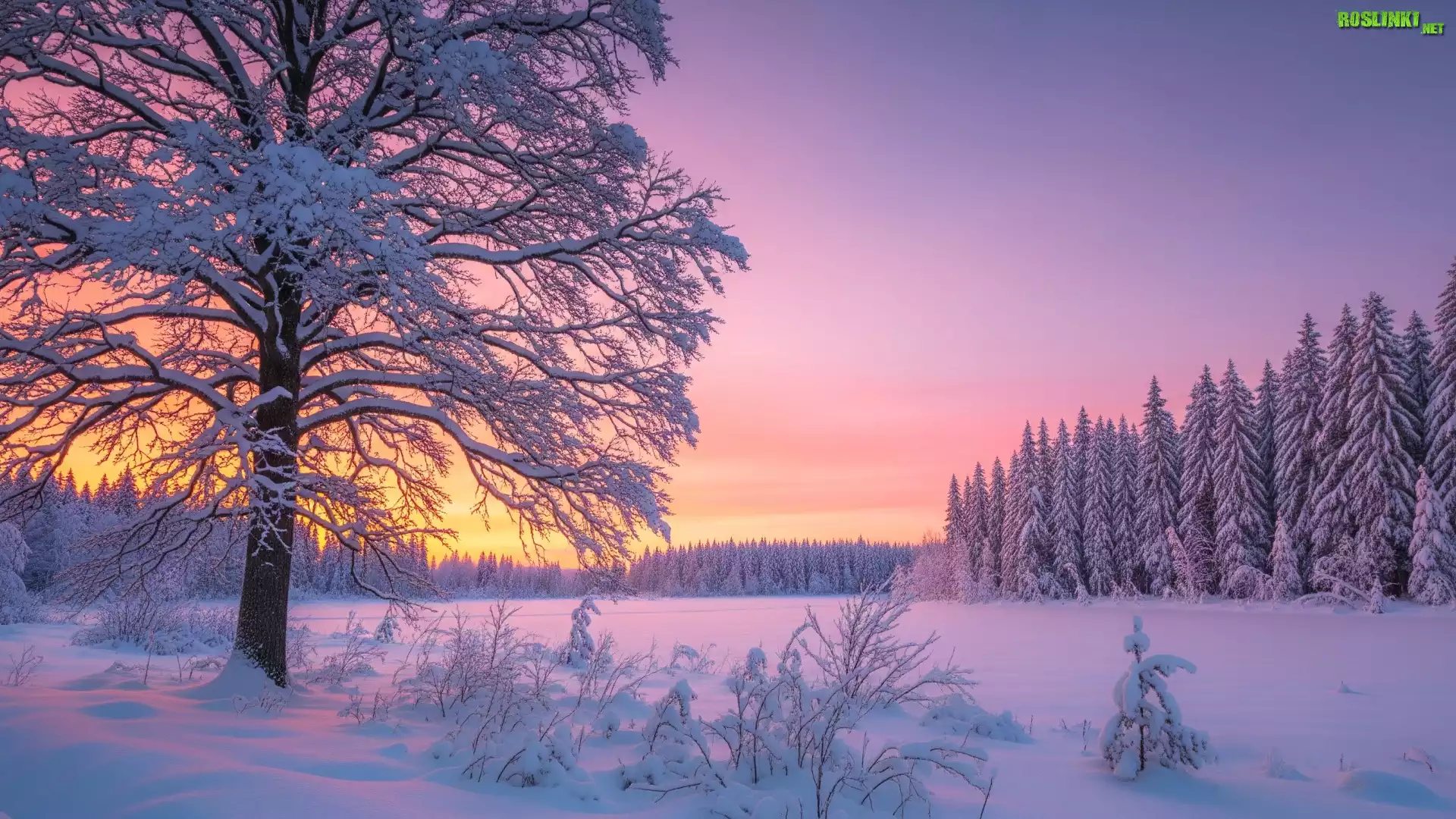 Rośliny: Zima, Drzewa, Krzewy, Ośnieżone, Zachód słońca