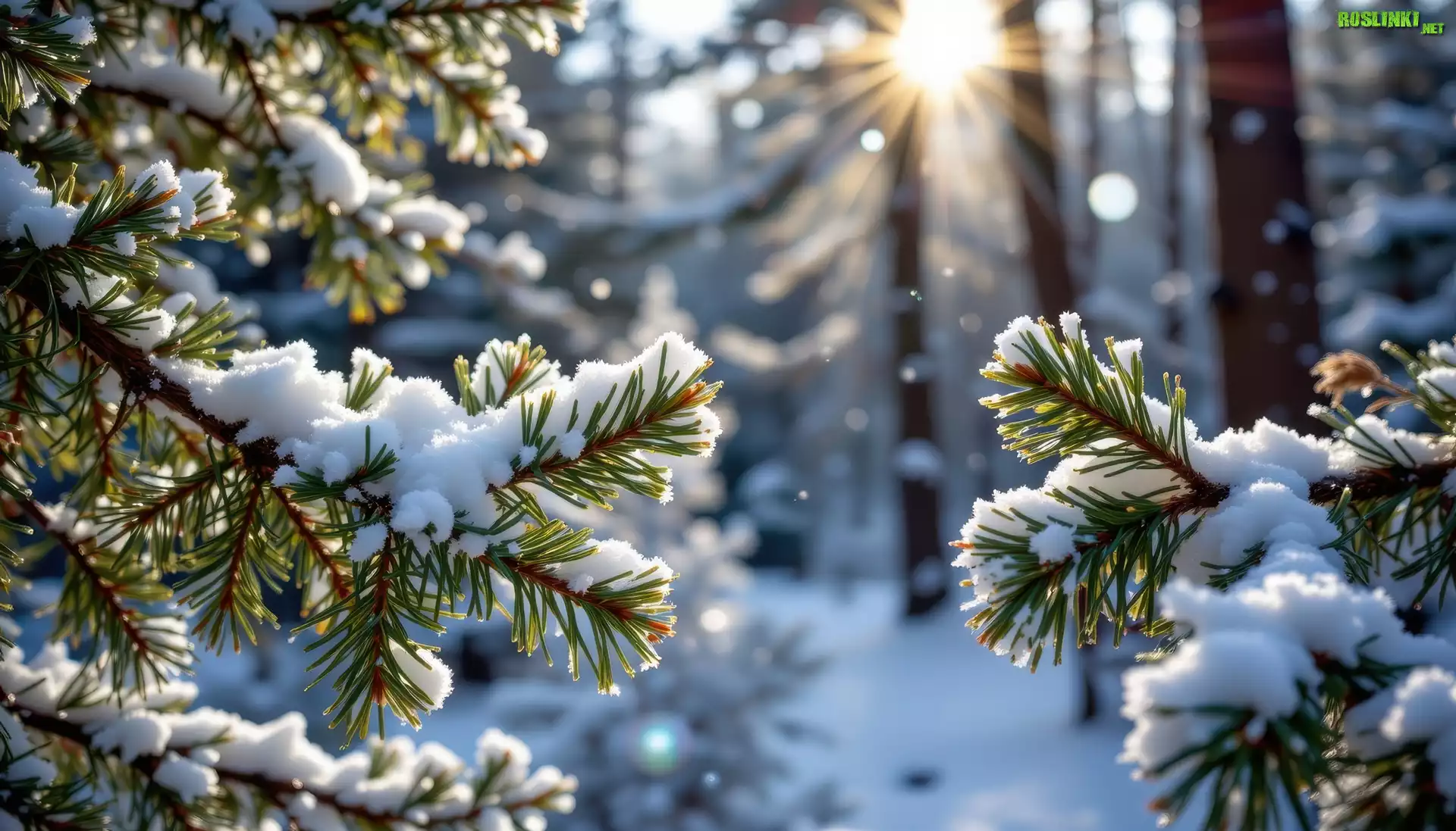 Rośliny: Ośnieżone, Gałązki, Świerk, Zima, Las, Promienie słońca, Grafika AI