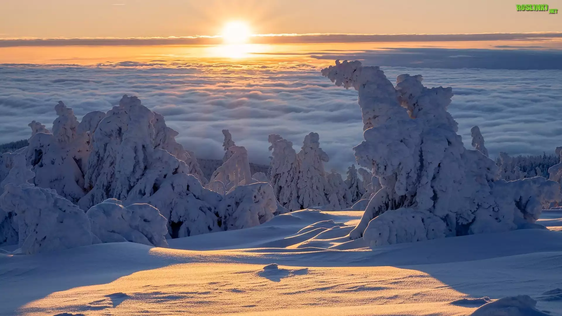 Rośliny: Zima, Wschód słońca, Ośnieżone, Drzewa, Opadająca, Mgła