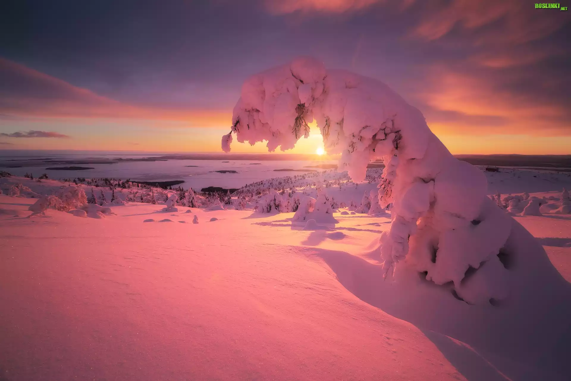 Zima, Pochylone, Osnieżone, Drzewo, Zachód słońca, Zatoka Kandałaksza, Półwysep Kolski, Rosja |