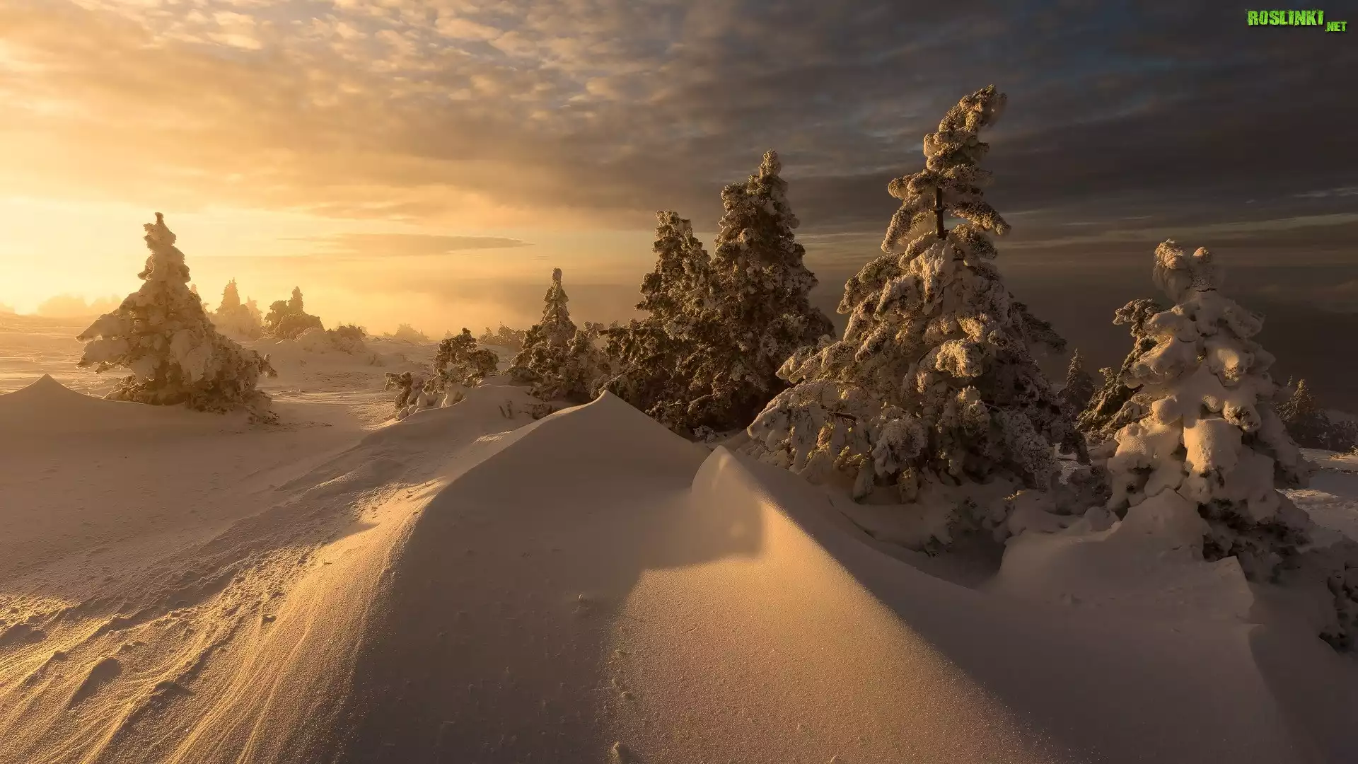 Rośliny: Wschód słońca, Zima, Ośnieżone, Drzewa, Zaspy