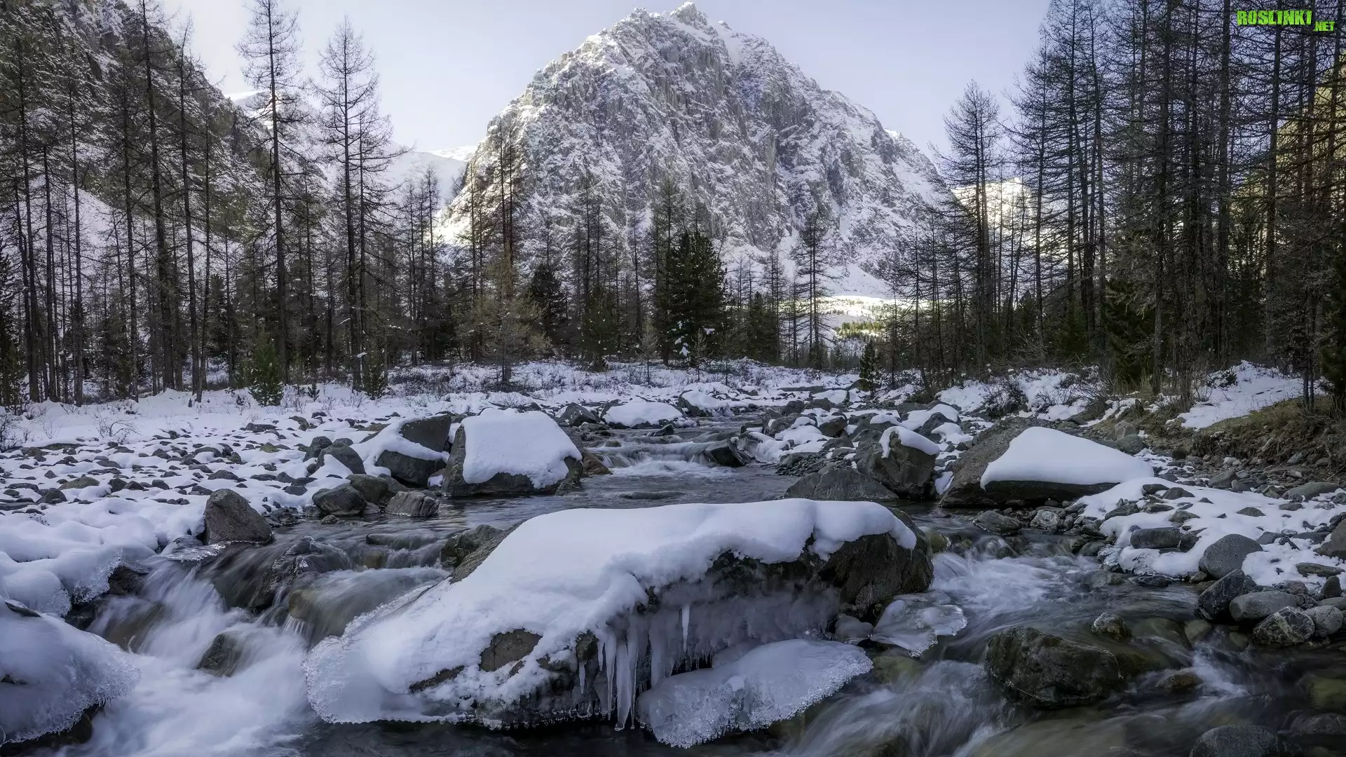 Rośliny: Zima, Ośnieżone, Góry, Rzeka, Kamienie, Śnieg, Drzewa
