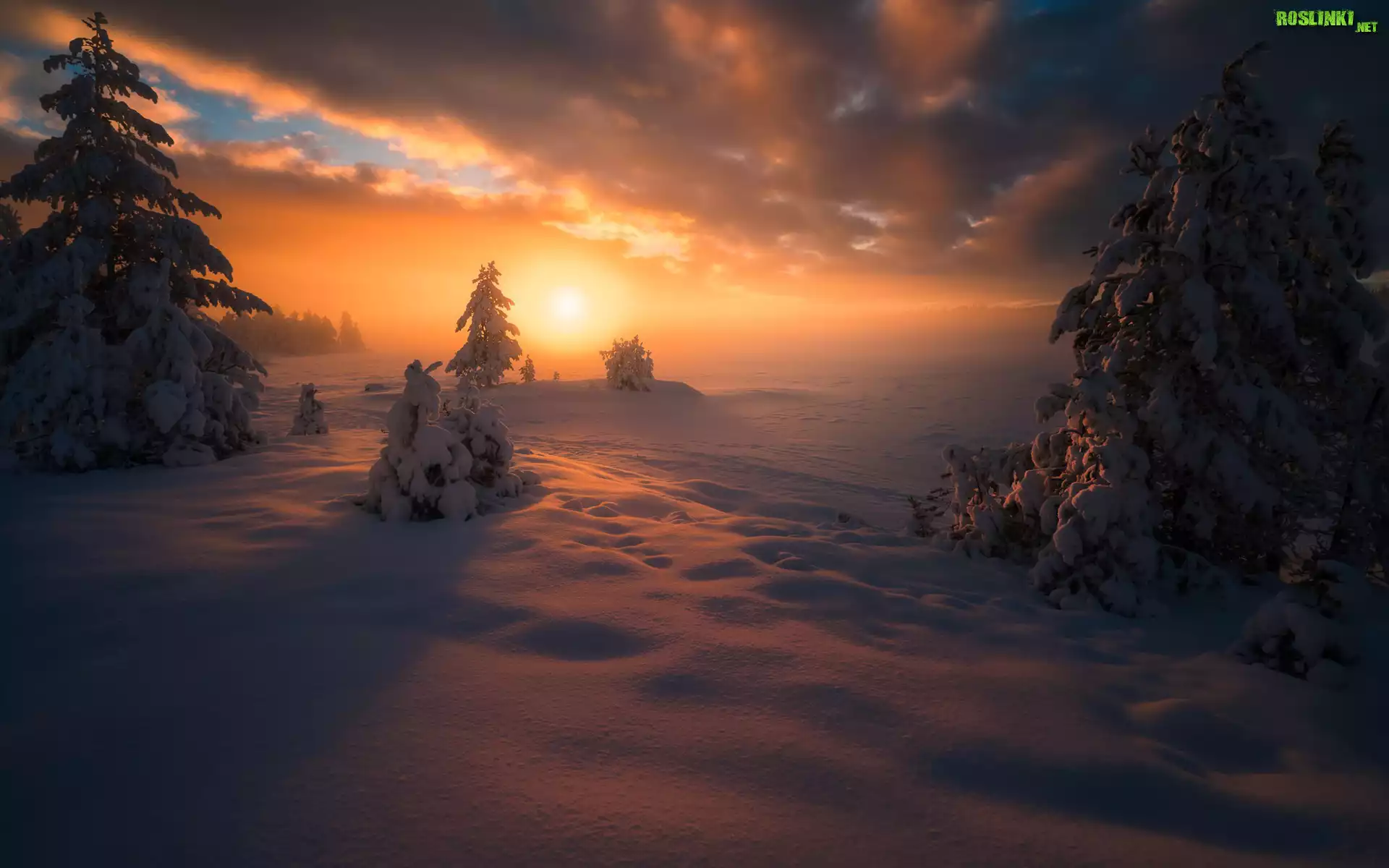 Rośliny: Ośnieżone, Drzewa, Zachód słońca, Zima, Chmury