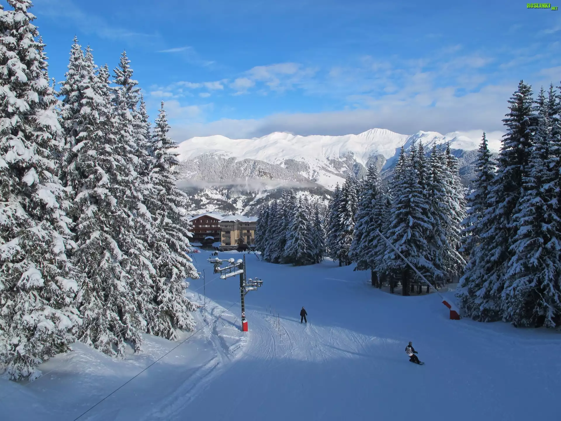 Ośrodek narciarski Courchevel, Góry, Alpy, Lasy, Ośnieżone, Drzewa, Zima, Miejscowość, Saint-Bon-Tarentaise, Sabaudia, Francja |