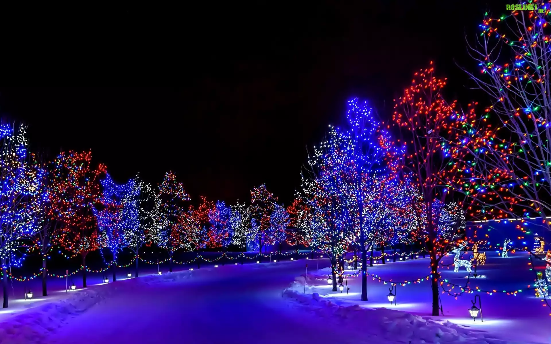 Rośliny: Oświetlona, Droga, Drzewa, Lampki, Zima