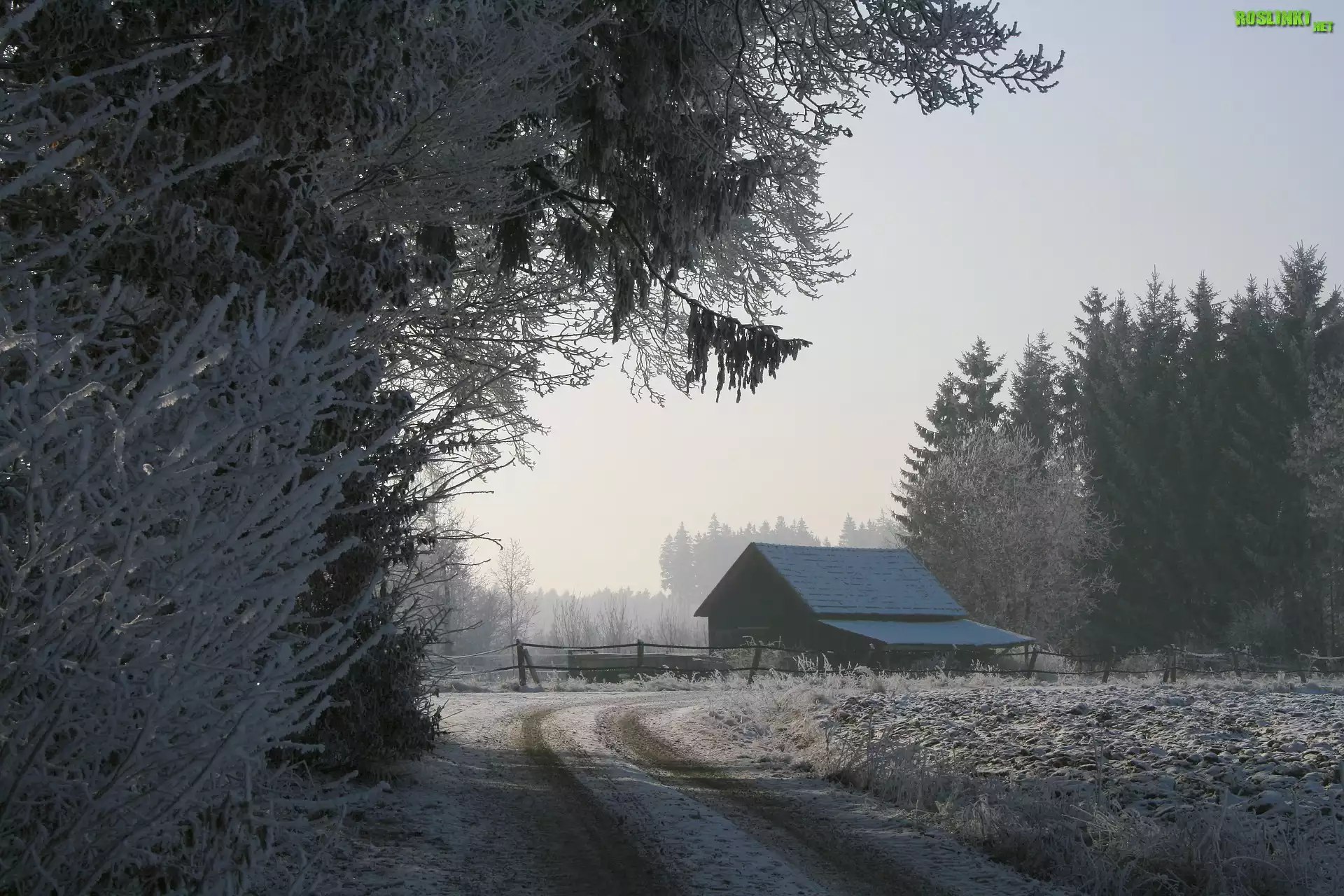 Rośliny: Zima, Oszronione, Drzewa, Droga, Szopa
