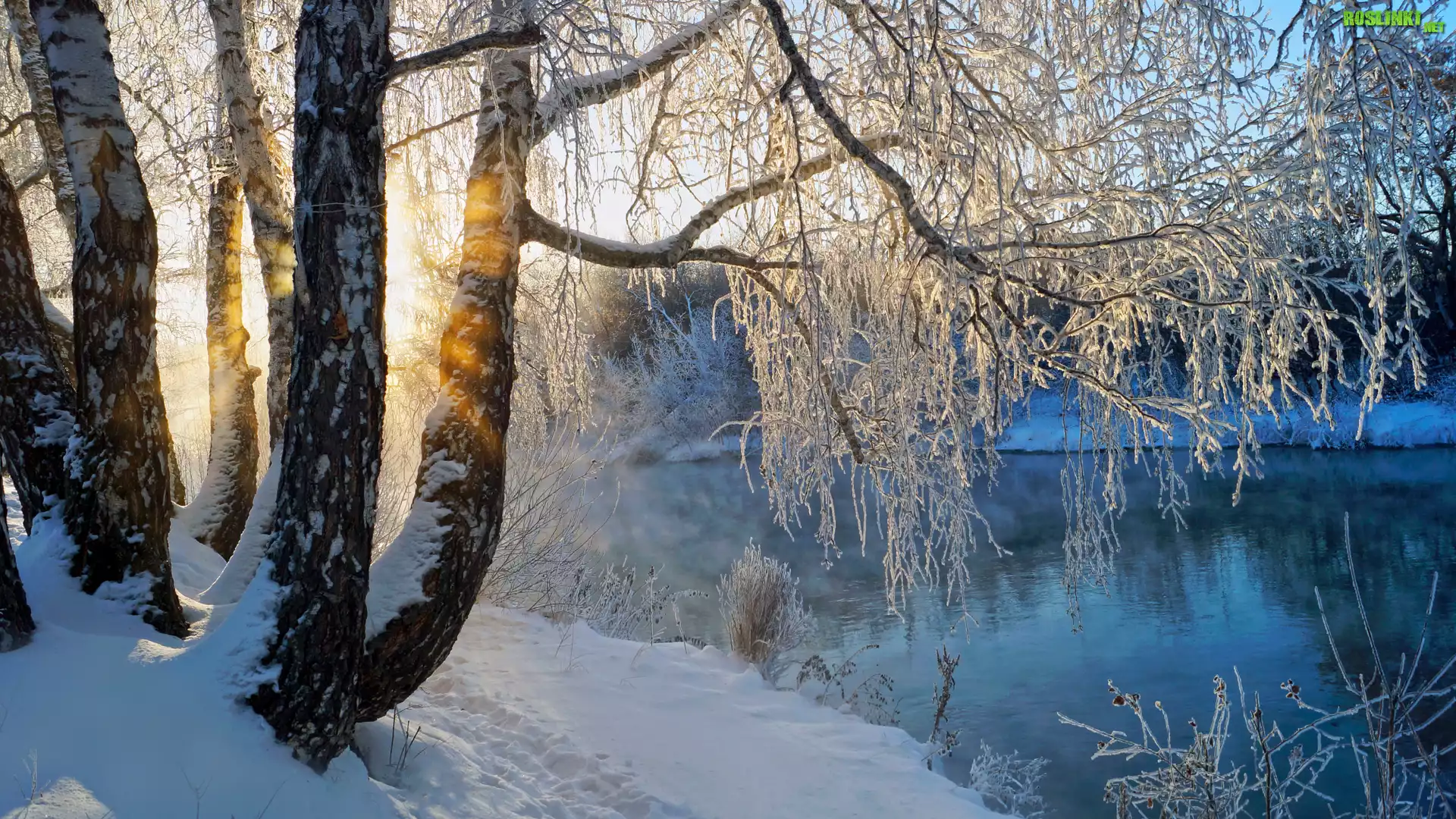 Brzozy, Oszronione, Gałęzie, Rzeka, Zima