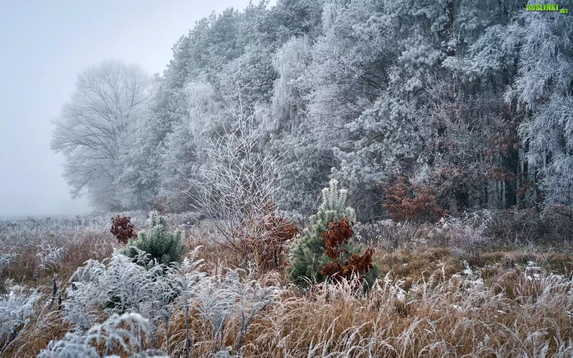 Oszronione, Drzewa, Las, Trawa, Mgła