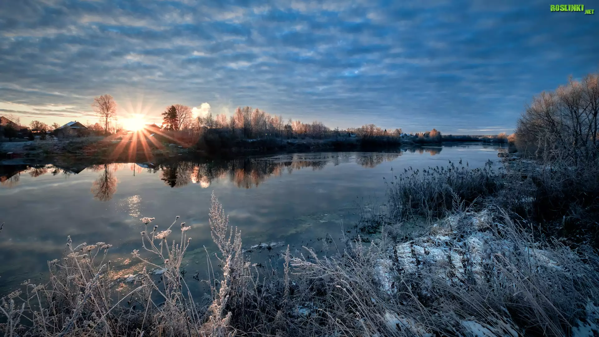 Rośliny: Rzeka Dubna, Krzewy, Szron, Drzewa, Chmury, Promienie słońca, Łatgalia, Łotwa
