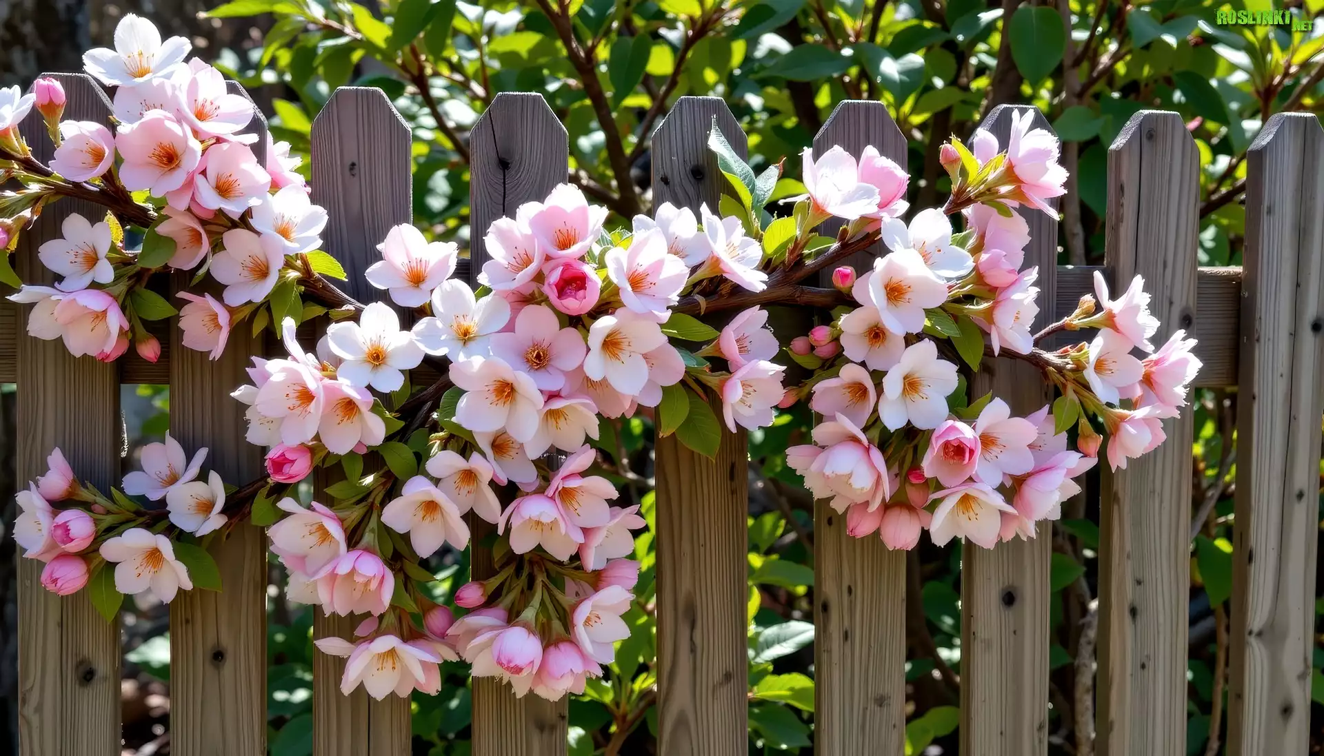 Rośliny: Kwiaty, Gałąź, Drzewo owocowe, Płot, Grafika AI