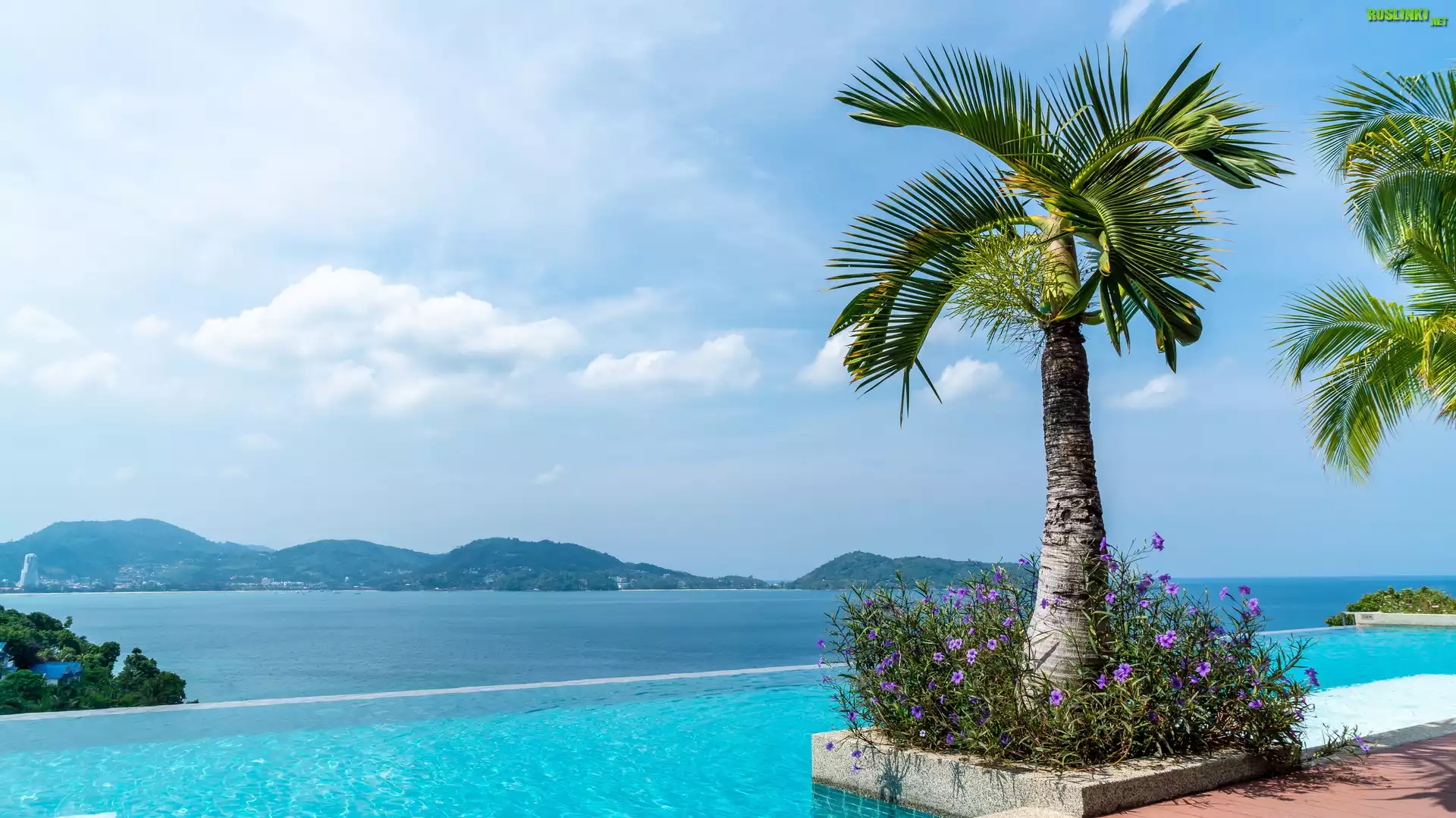 Palmy, Morze, Góry, Basen, Kwiaty