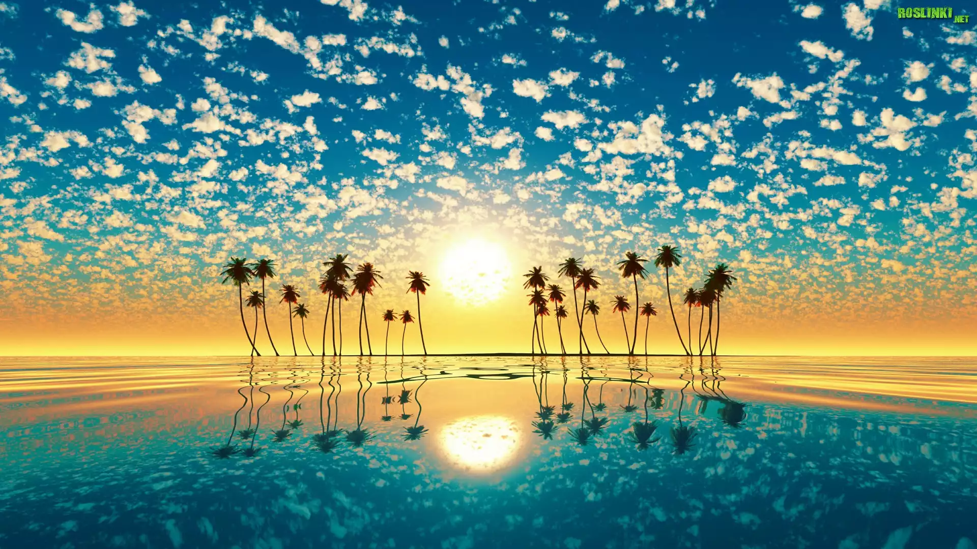 Rośliny: Drzewa, Palmy, Zachód słońca, Chmury, Morze, Odbicie