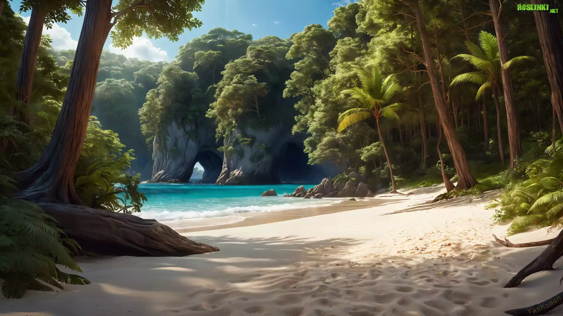 Rośliny: Morze, Plaża, Drzewa, Palmy, Skały, Grafika