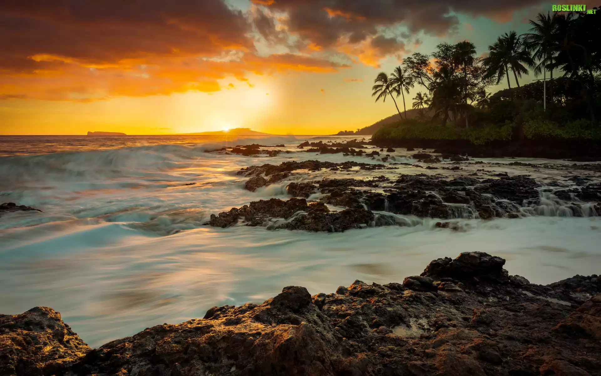 Rośliny: Stany Zjednoczone, Hawaje, Maui, Morze, Fale, Kamienie, Palmy, Brzeg, Zachód słońca