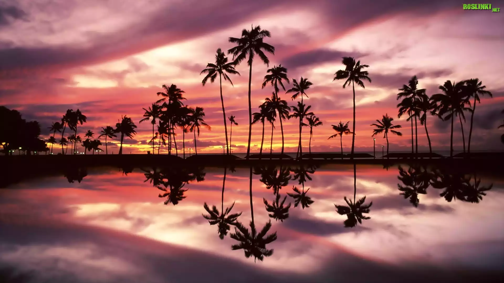 Palmy, Zachód, Słońca, Chmury, Odbicie, Hawaje