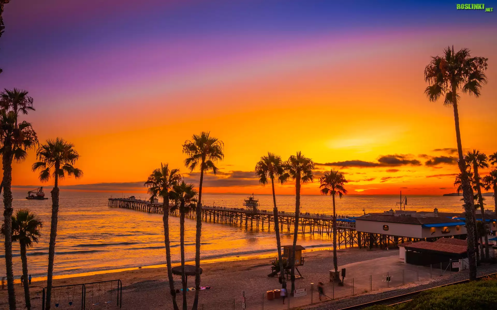 Rośliny: Morze, Molo, Palmy, Plaża, San Clemente, Zachód słońca, Kalifornia, Stany Zjednoczone