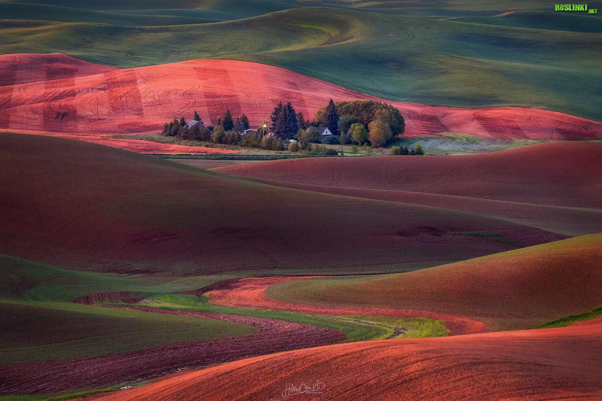 Rośliny: Pola uprawne, Pagórki, Domy, Drzewa, Palouse, Hrabstwo Whitman, Stan Waszyngton, Stany Zjednoczone