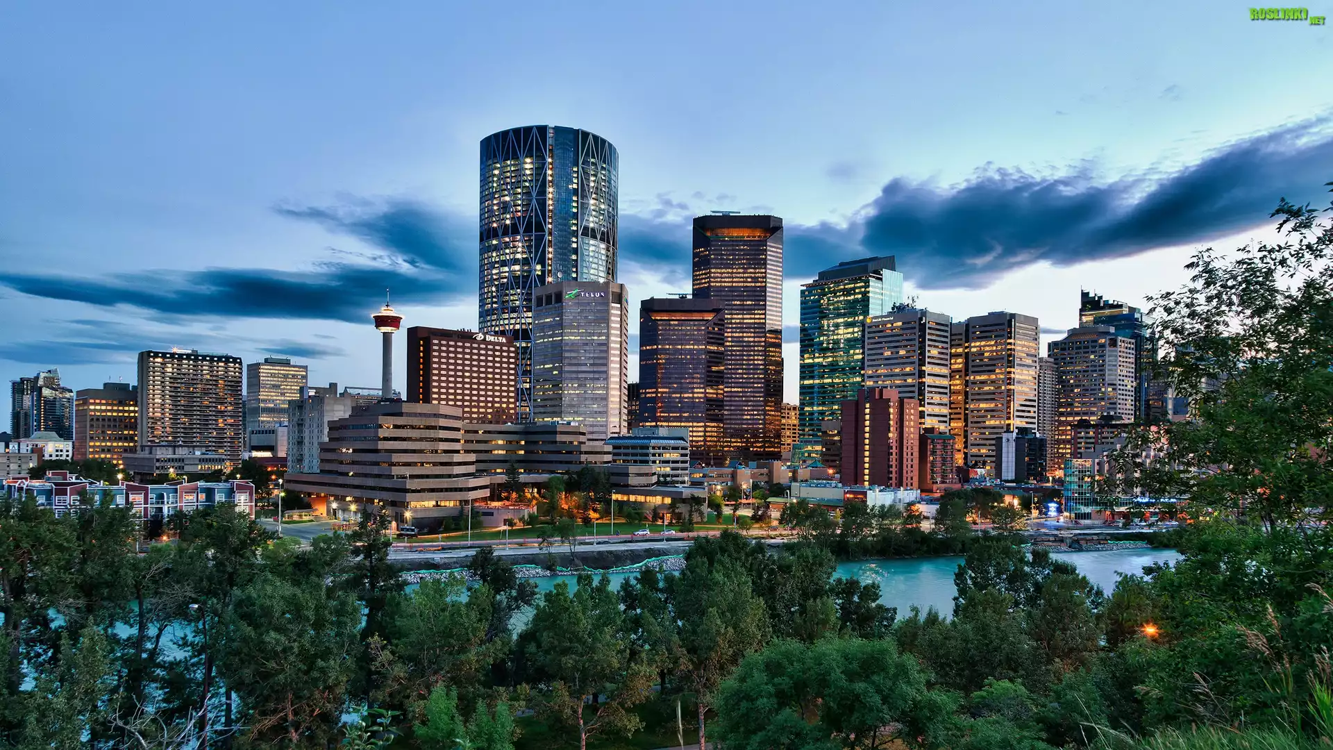 Rośliny: Calgary, Panorama, Miasta, Rzeka, Bow, Chmury, Drzewa