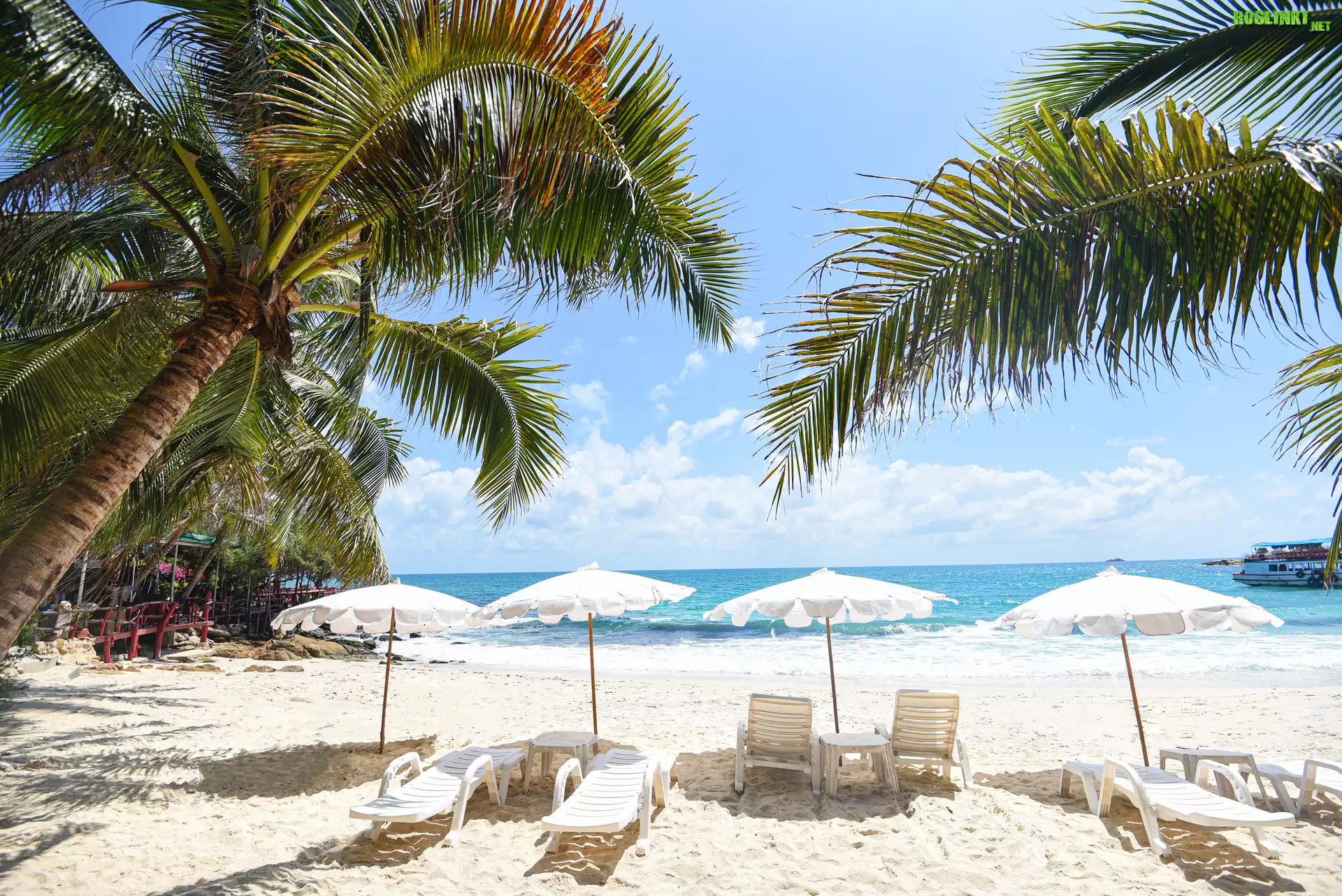 Rośliny: Morze, Plaża, Leżaki, Parasole, Palmy, Liście
