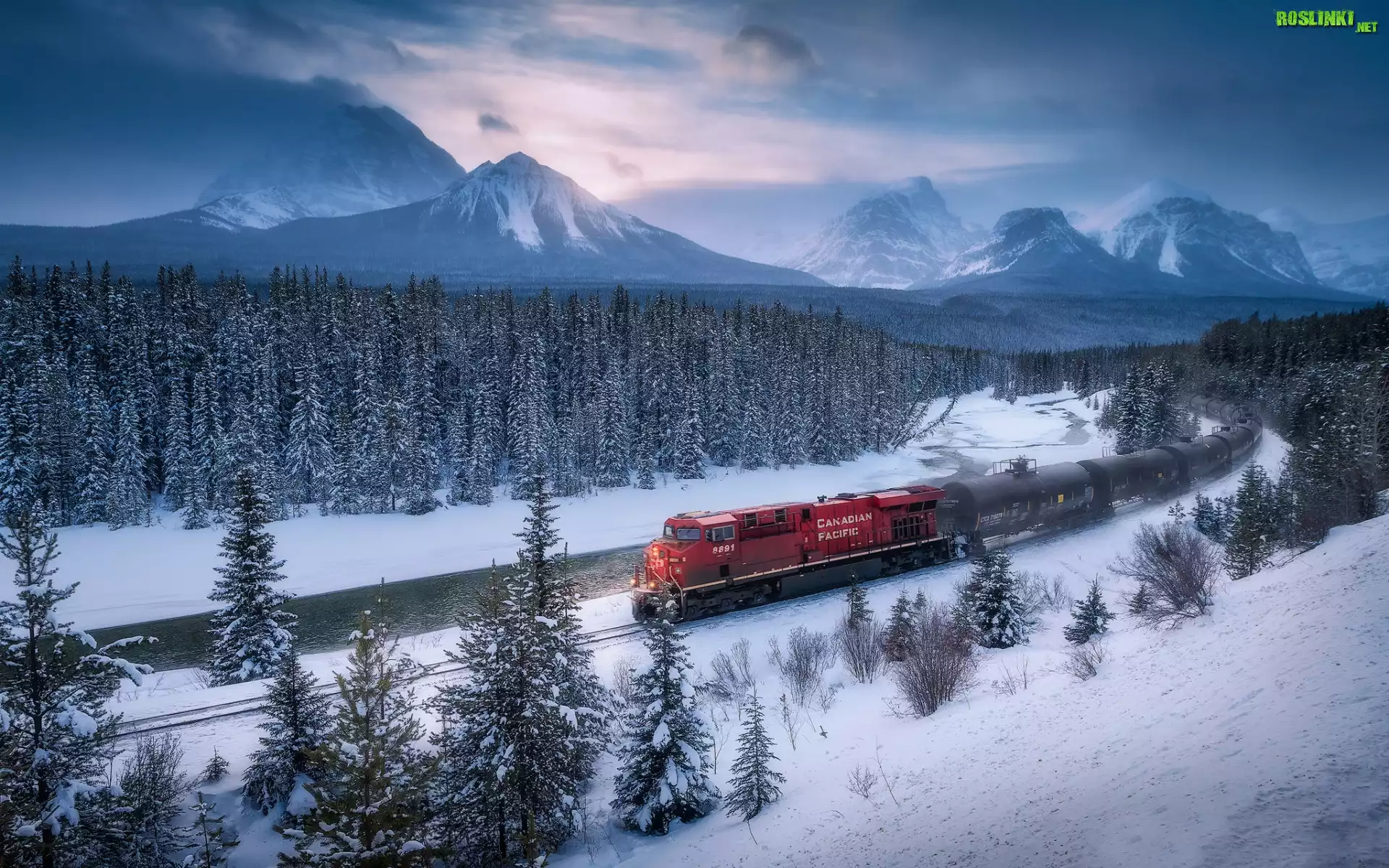 Park Narodowy Banff, Góry Skaliste, Rzeka, Bow River, Pociąg, Drzewa, Lasy, Śnieg, Chmury, Zima, Alberta, Kanada |