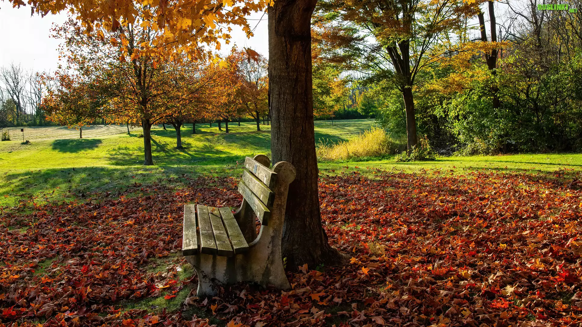 Rośliny: Park, Jesień, Opadłe, Liście, Ławka, Drzewa