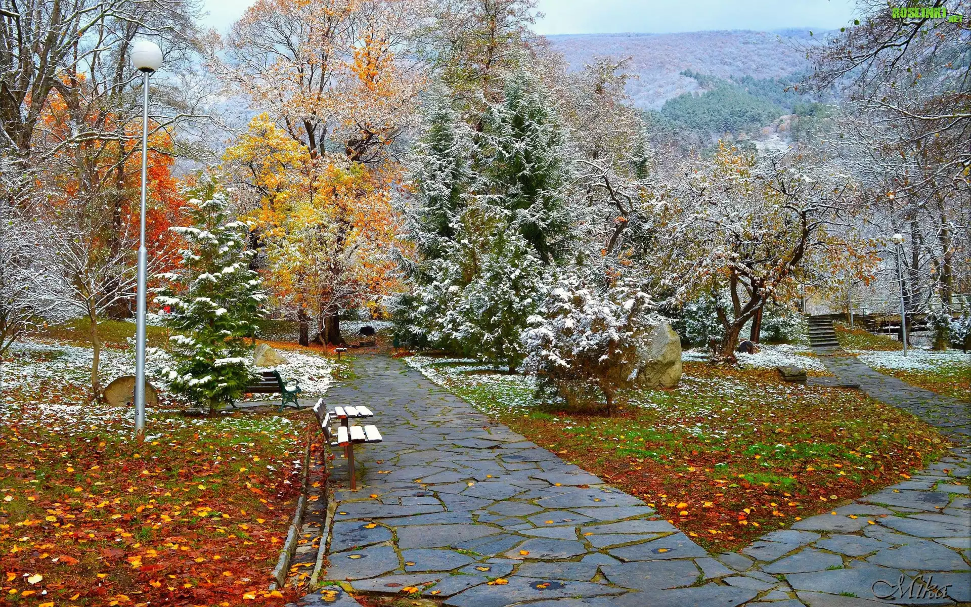 Rośliny: Park, Jesień, Śnieg, Drzewa, Ławki, Alejki