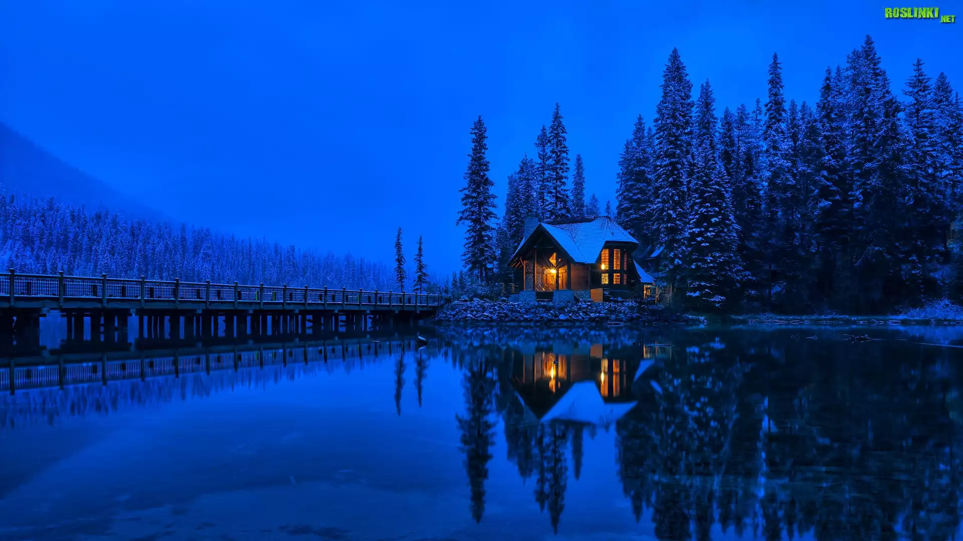 Park Narodowy Yoho, Jezioro, Emerald Lake, Dom, Oświetlony, Most, Góry, Las, Drzewa, Prowincja Kolumbia Brytyjska, Kanada |
