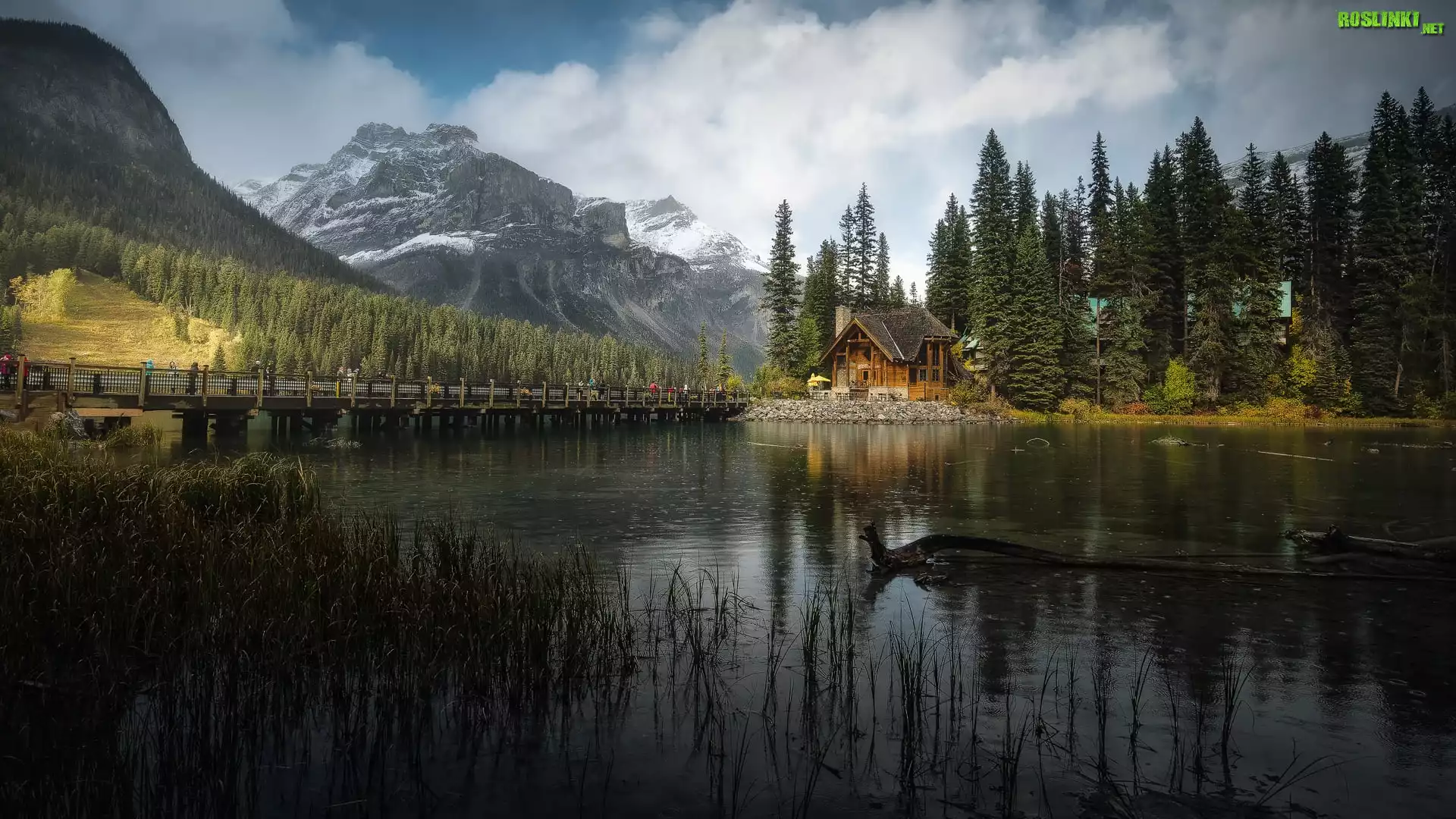Park Narodowy Yoho, Dom, Most, Jezioro, Emerald Lake, Góry, Drzewa, Chmury, Prowincja Kolumbia Brytyjska, Kanada |