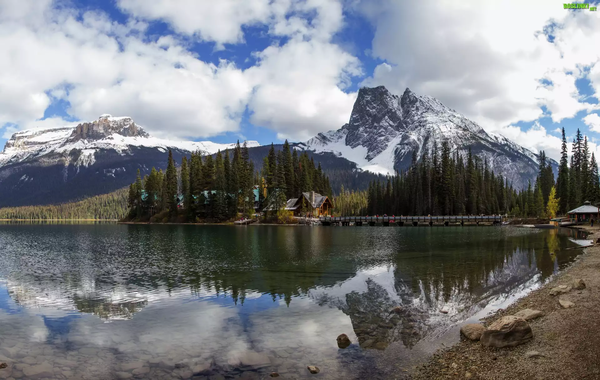 Park Narodowy Yoho, Góry, Las, Drzewa, Jezioro Emerald Lake, Domy, Most, Chmury, Prowincja Kolombia Brytyjska, Kanada |