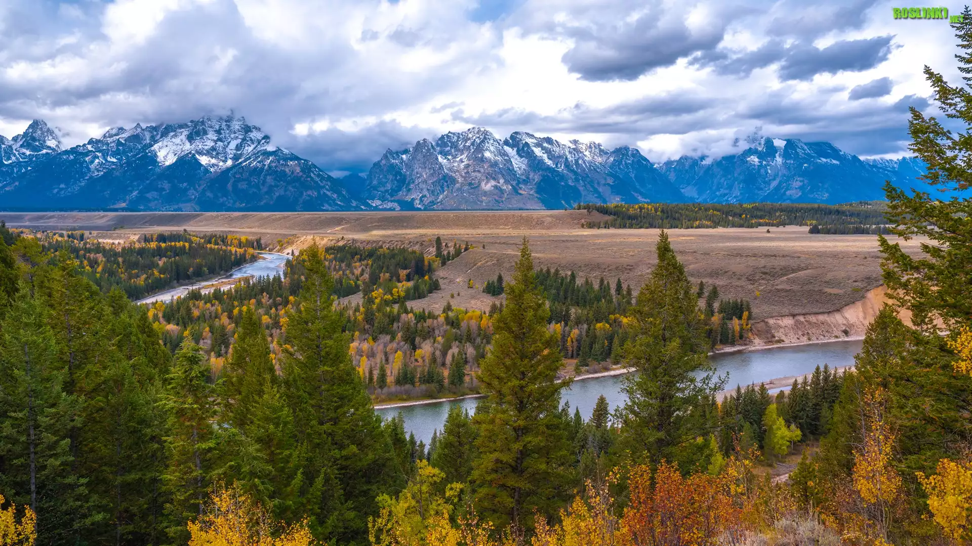 Park Narodowy Grand Teton, Góry, Teton Range, Las, Drzewa, Chmury, Rzeka Snake River, Stan Wyoming, Stany Zjednoczone |