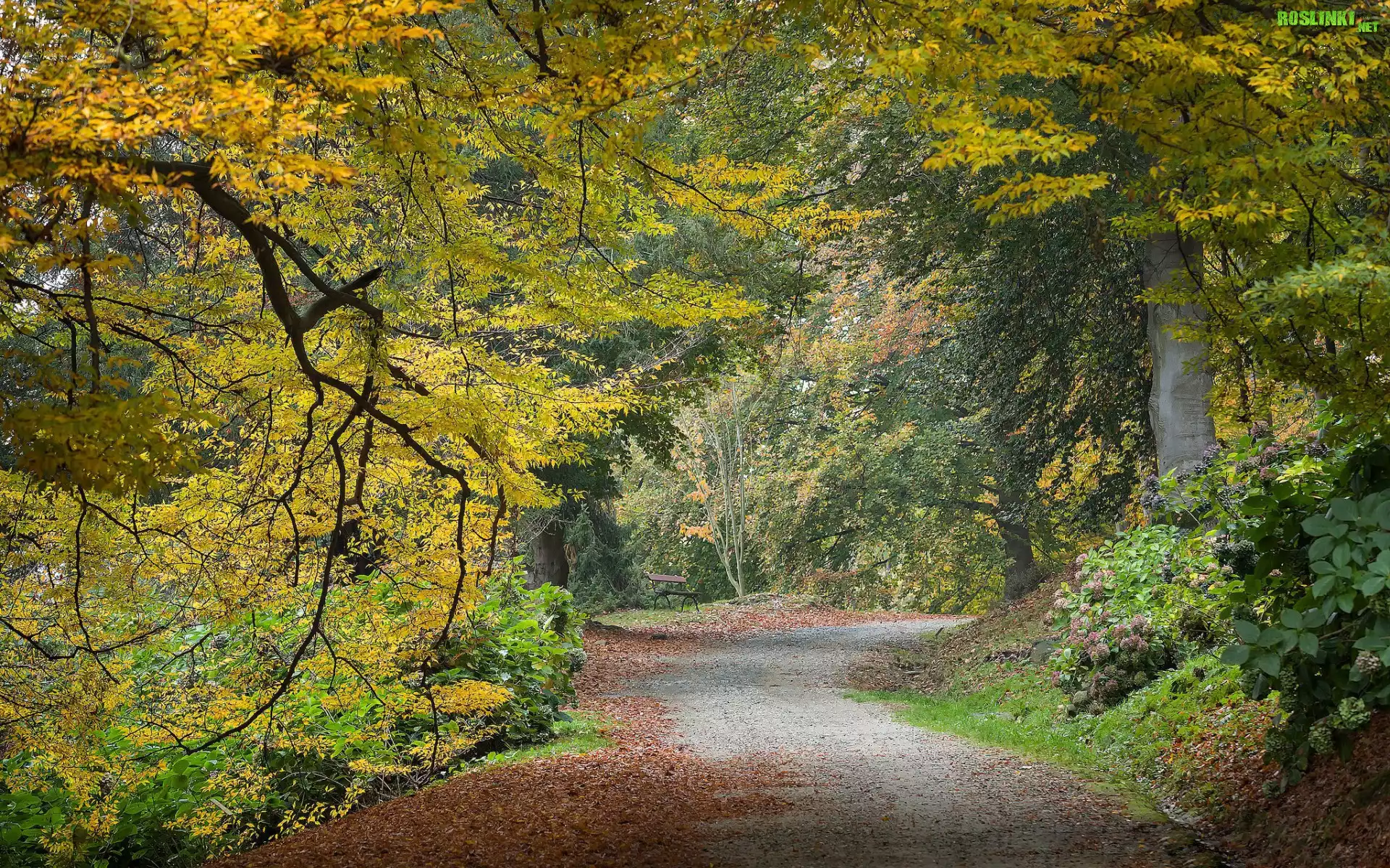Rośliny: Park, Drzewa, Żółknące, Liście, Droga, Ławka