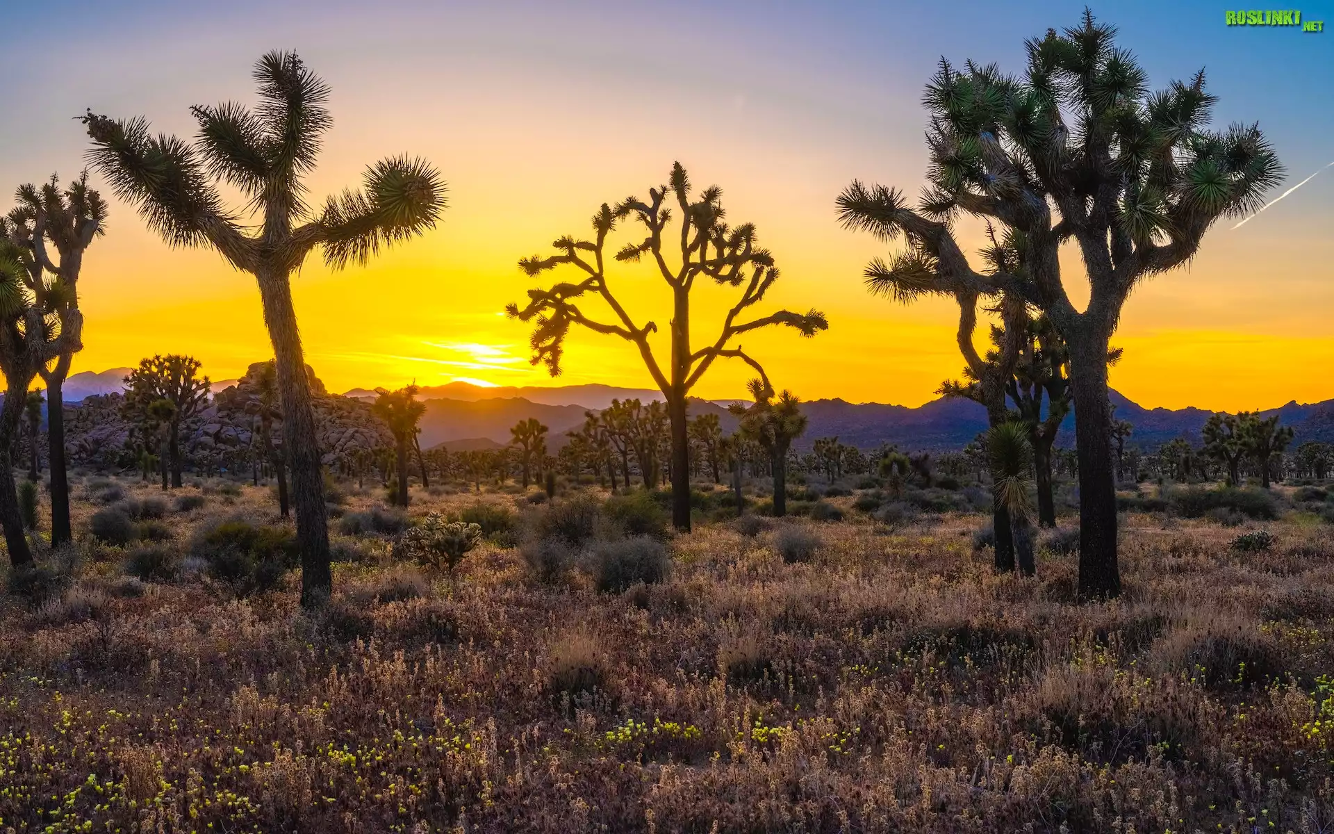 Stany Zjednoczone, Kalifornia, Park Narodowy Joshua Tree, Wschód słońca, Drzewa Jozuego, Wzgórza, Trawa |